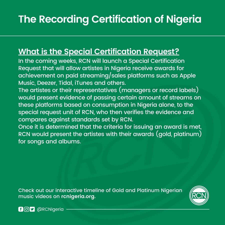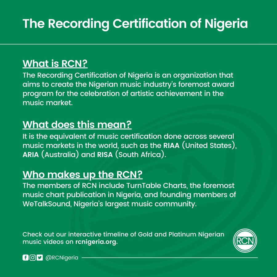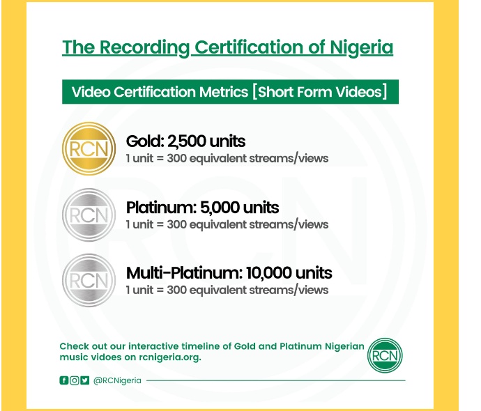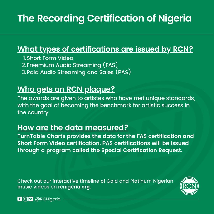First of all, music recording certification is a way of certifying that a record has sold or streamed a certain amount of units. The requirements for this are based solely on the certifying bodies representing the Music Industry in various countries worldwide like the RIAA for the United States of America and now the RCN for Nigeria.