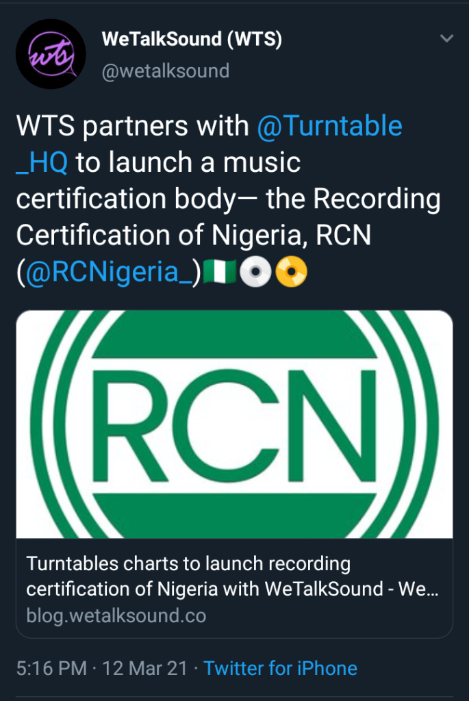 Yesterday, WeTalkSound took to Twitter to announce the launch of Nigeria’s first music certification body in collaboration with TurnTable Charts.